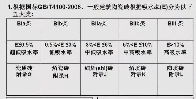 根据国家标准 GB/T4100- 2006,其中对一般建筑陶瓷砖进行了分类。根据吸水率,用大写字母E代表,分为了五大类。