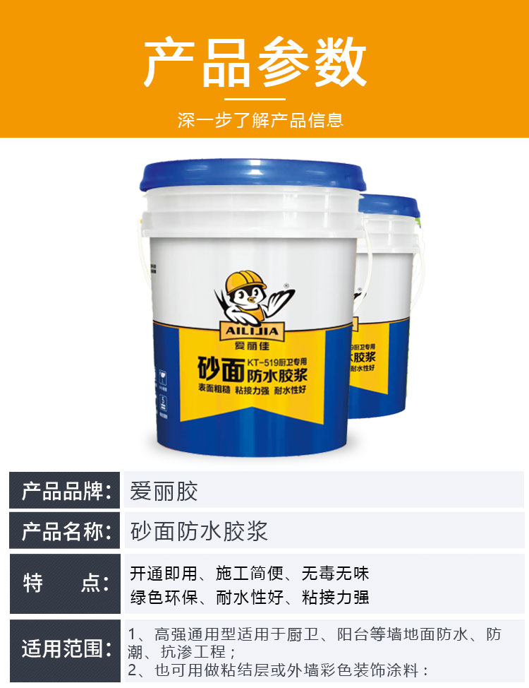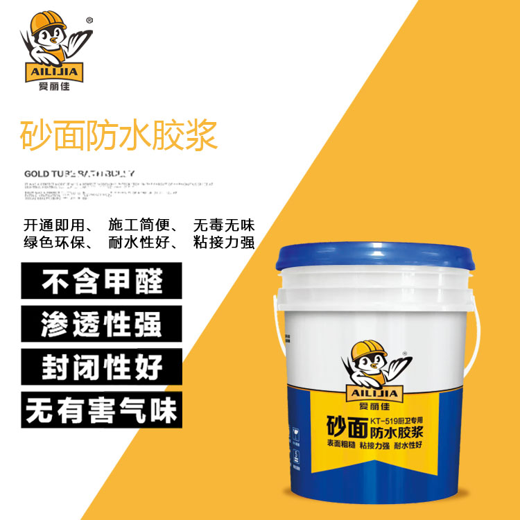 KT-519厨卫专用砂面防水胶浆,是佛山市凯聚科技有限公司研发一款“开桶即用”彩色单组份砂面防水胶浆,采用聚合物乳液、石粉、石英砂及各种水性组成。