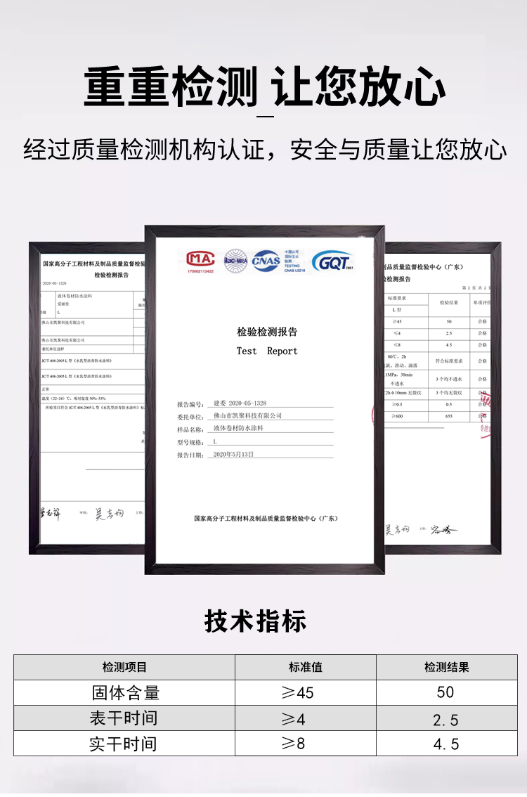 3、力学性能优异,具有高弹性,粘结力超强、耐老化等特点,更适合基面结构易开裂和变形部位的防水处理,正确施工后具有不脱落不起皮的效果。