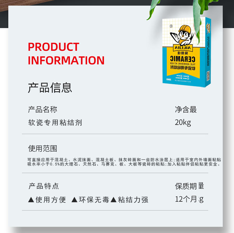 软瓷专用粘结剂(瓷砖胶)是由优质水泥、精制砂、凝胶粉、改性剂混合而成,其施工操作性能、粘结性能较传统的水泥沙浆大幅改善,具有粘结强度高,不泛碱,不渗水,不空鼓等特点。表面处理