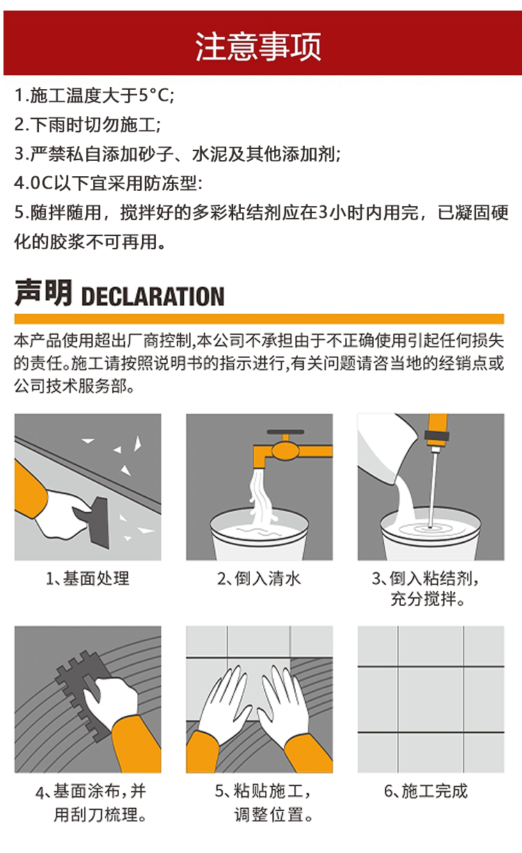 5.随拌随用,搅拌好的多彩粘结剂应在3小时内用完,已凝固硬化的胶浆不可再用。