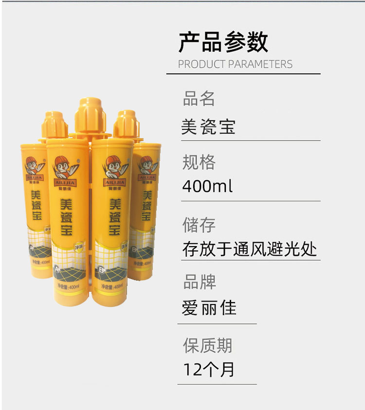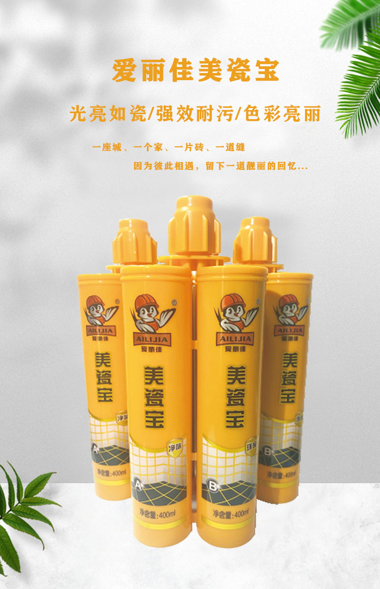 爱丽佳美瓷宝是一种适用于室内墙、地面瓷砖填缝、厨卫间卫浴以及壁柜边角装饰的新型装饰材料。本产品采用进口环保原料,由环氧树脂聚合物研制而成,固化后外观色彩艳丽、光泽度好、防水防潮、无毒无味、防霉防菌、环保美观、易擦洗清洁、有效解决瓷砖缝隙的多种问题。
