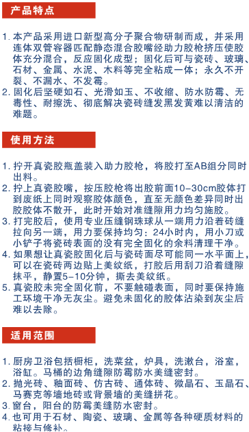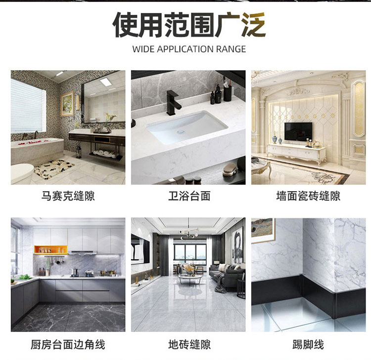 1、瓷砖、马赛克、石材、木板、玻璃等材料的缝隙填充、防霉、防菌、防水、装饰等作用。