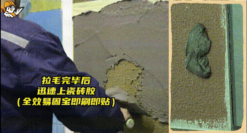 全效易固宝双组分背胶涂刷/滚涂后可直接上瓷砖胶进行施工,胶浆渗透固化后,强化基面基材和提高混凝土砂浆的粘结强度,还具有一定的柔性,能解决瓷砖及石材贴砖后热胀冷缩而空鼓、脱层、掉砖等问题。即刷即贴,无需等待,节省工时更高效。